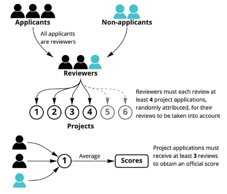 Resource allocation is crucial for the development of innovative projects in science and technology. In response to the urgent COVID-19 pandemic in 2020, we implemented an agile “community review” system with JOGL to quickly allocate micro-grants for the prototyping of innovative solutions. In this paper published in f1000Research we analyzed the results of 7 review cycles. Implemented across 147 projects, this process is characterized by its speed (median duration of 10 days), scalability (4 reviewers per project regardless of the total number of projects), and robustness, measured by the preservation of the projects’ ranking order after the random removal of reviewers. Including applicants in the review process does not introduce significant bias, showing a correlation of r=0.28 between evaluations, similar to that observed for non-applicants and within traditional funding methods. This system allows for agile improvement of proposals, promoting the implementation of successful early prototypes and the constructive revision of initially rejected projects. This work demonstrates the effectiveness of a frugal community review for agile resource allocation in open innovation contexts.