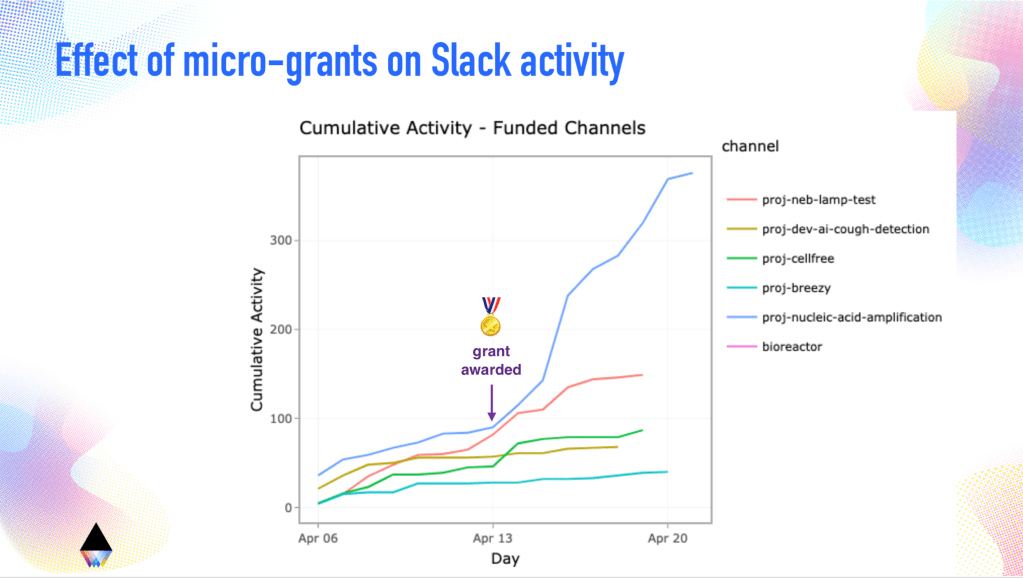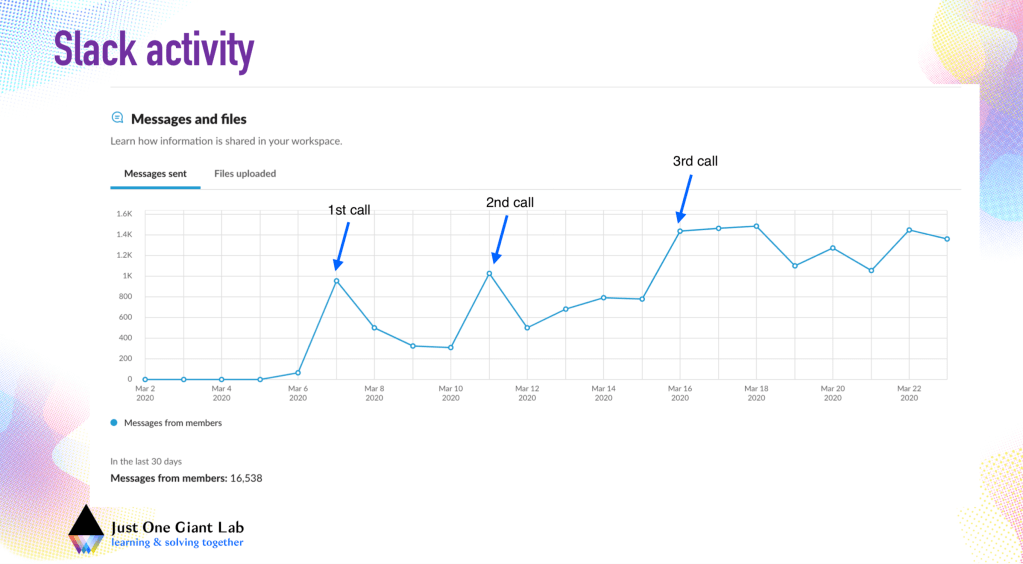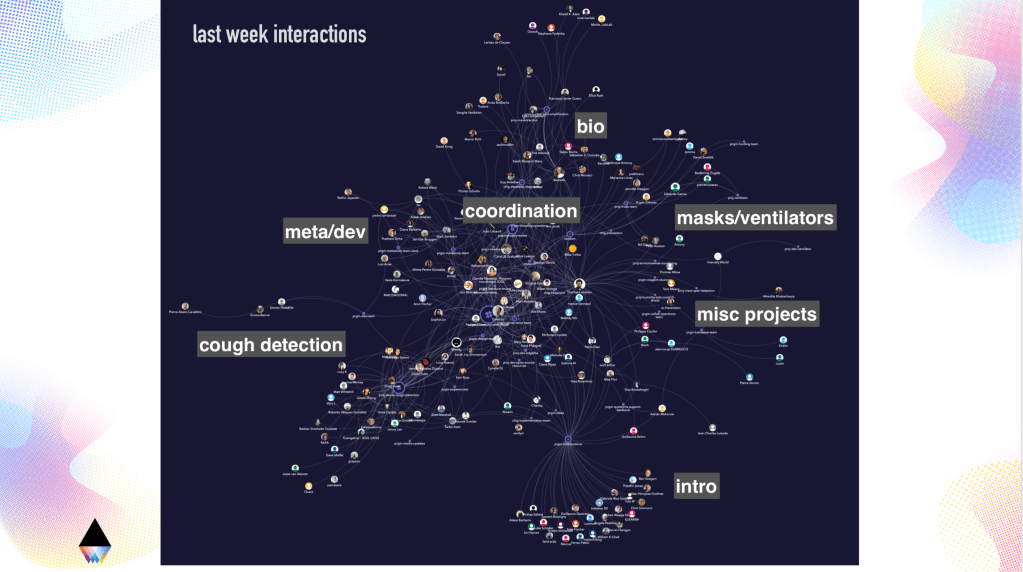 During that time, I have led the metastudy effort to better understand how this community organises, and build tools to monitor its evolution. One aspect of this work is to use data from the JOGL platform to build a recommender system allowing for a matchmaking between project needs and contributor skills / resources. Another aspect has been to gather data from the Slack where the community organises and i) implement a TeamChatViz open-source dashboard to monitor its evolution and 2) develop a research strategy to understand what makes some projects sustain their activity, as well as what creates roadblocks in community coordination.