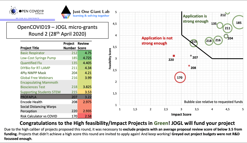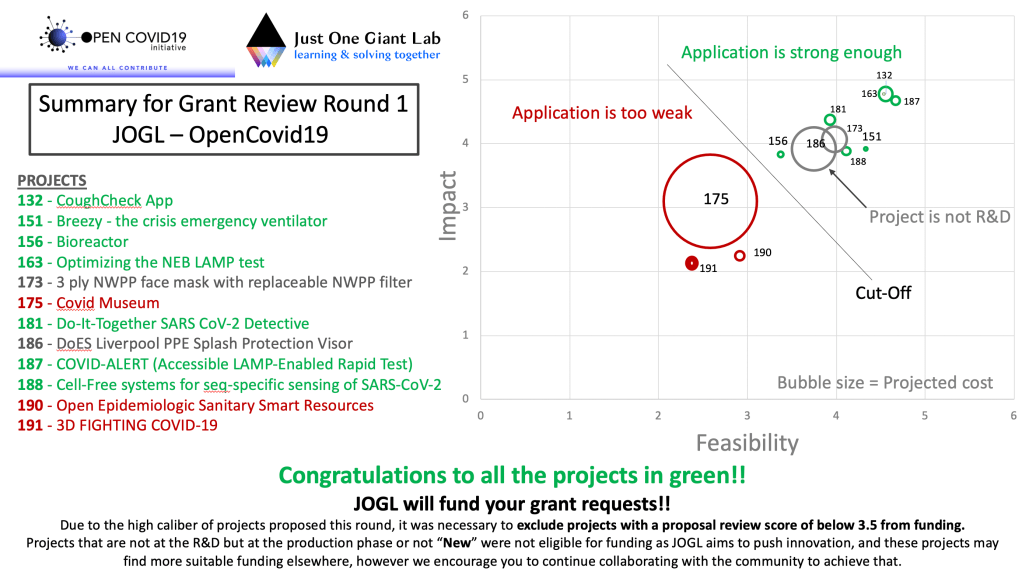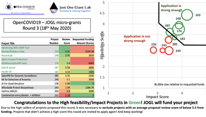 Since March 2020, a massive community of 4,000+ contributors has grown on Just One Giant Lab to develop open-source and low-cost tools and methodologies that are safe and easy to use to fight the COVID-19 pandemic. We have organised this effort under a research program, with 100,000 euros of funding from Axa Research Funds that we are redistributing to projects as micro-grants capped at 3,000 euros under a community peer-review system.